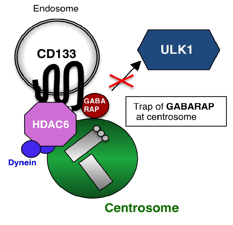 Figure 1: Schematic image of the centrosomal localization of endosomal CD133. Under conditions in which Src family kinase is inactivated, non-phosphorylated CD133 is transported from the plasma membrane to the intracellular region through endocytosis. After endocytosis, HDAC6 and dynein motors assist CD133 endosome trafficking along microtubules to centrosomes. Endosomal CD133, which localizes to centrosomes, captures GABARAP to inhibit the GABARAP-ULK1 interaction, thereby suppressing the initiation of autophagy.