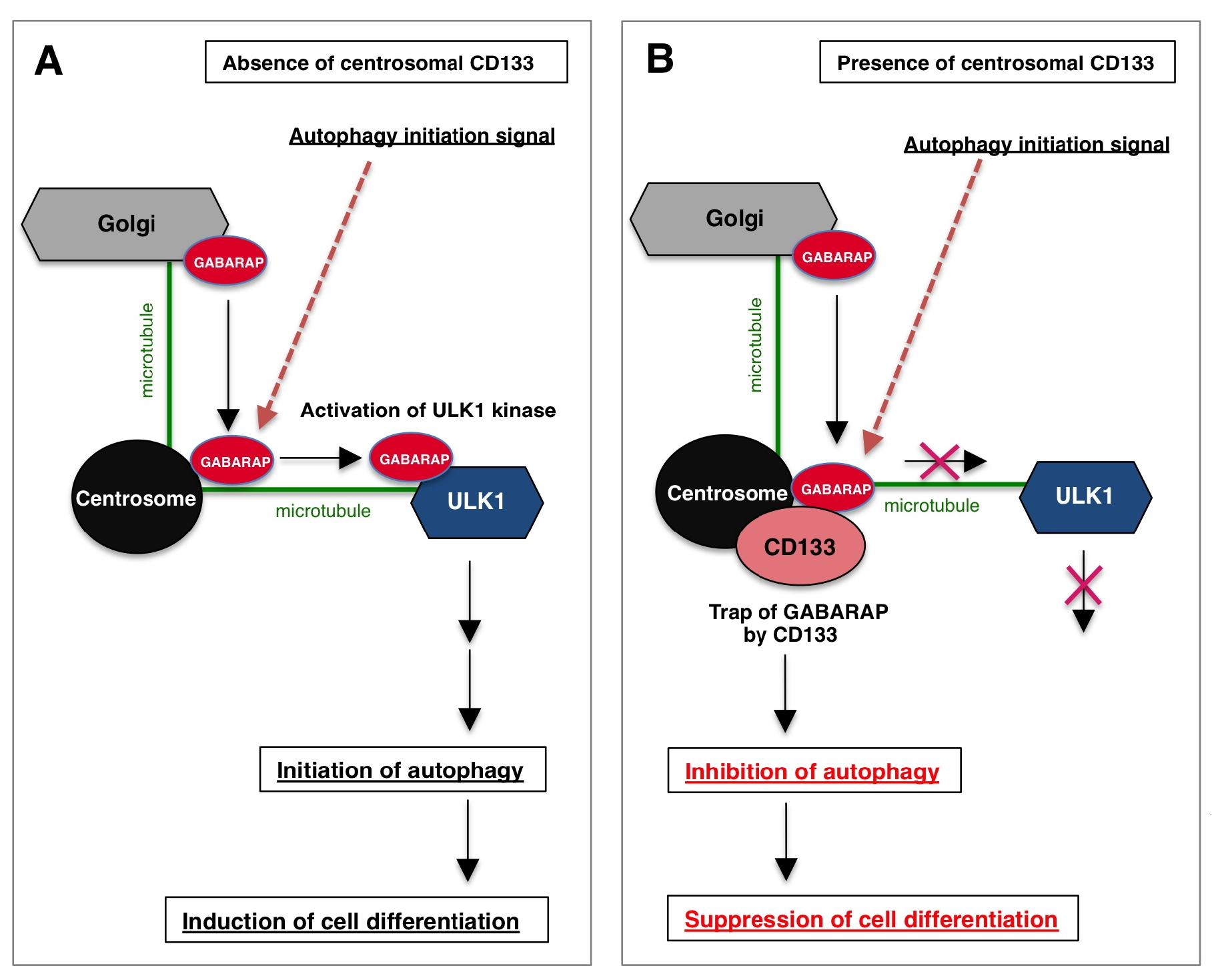 Figure 2: Schematic image of the centrosomal function of CD133 in cells. (A) In the absence of centrosomal CD133, when the autophagy initiation signal is activated, centrosome localized-GABARAP moves along microtubules and binds to ULK1, the top of the autophagy signal cascade, resulting in the activation of ULK1. Activated ULK1 then induces autophagy, and cell differentiation occurs. (B) In the presence of centrosomal CD133, when the autophagy initiation signal is activated, centrosome localized-GABARAP is captured by CD133, thereby inhibiting GABARAP-ULK1 complex formation. As a result, the autophagy initiation signal is inhibited and cell differentiation is suppressed. Thus, centrosomal CD133 has the unique property of maintaining the undifferentiated state of cells by inhibiting autophagy.