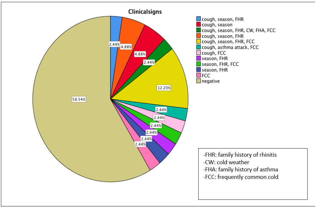 Fifty-nine percent of children suffered from chronic cough, while the start age of coughing in the affiliated children was 2-4-year-old (70.6%) (Table 3). Other risk factors, including cold weather, the season of symptom crisis and family history, were observed in 5.9%, 76.5% and 23% of children, respectively. Rhinitis, pneumonia and asthma attacks were also observed in 94.1%, 5.9% and 5.8%, respectively. Almost 59% of the children experienced the common cold frequently in winter.