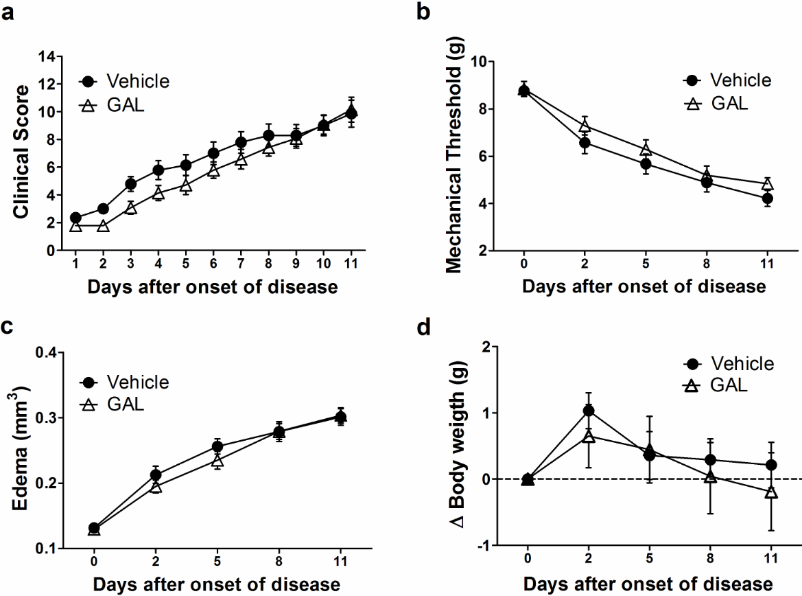 As a result of severe arthritis development, it was observed increased paw edema in the vehicle and the GAL-treated mice in this set of experiments. Since two days after the disease onset, paw swelling had increased in both groups with the highest value on day 11 (vehicle: 0.301 ± 0.046 mm3; GAL: 0.303 ± 0.044 mm3) (Figure 2c). Additionally, there was no statistical difference between both experimental groups. Regarding body weight, the vehicle presented a stabilized body weight (0.21 ± 1.28g), and GAL-treated mice presented a loss of weight at the end of the experimental procedure (-0.19 ± 2.2g) (Figure 2d).