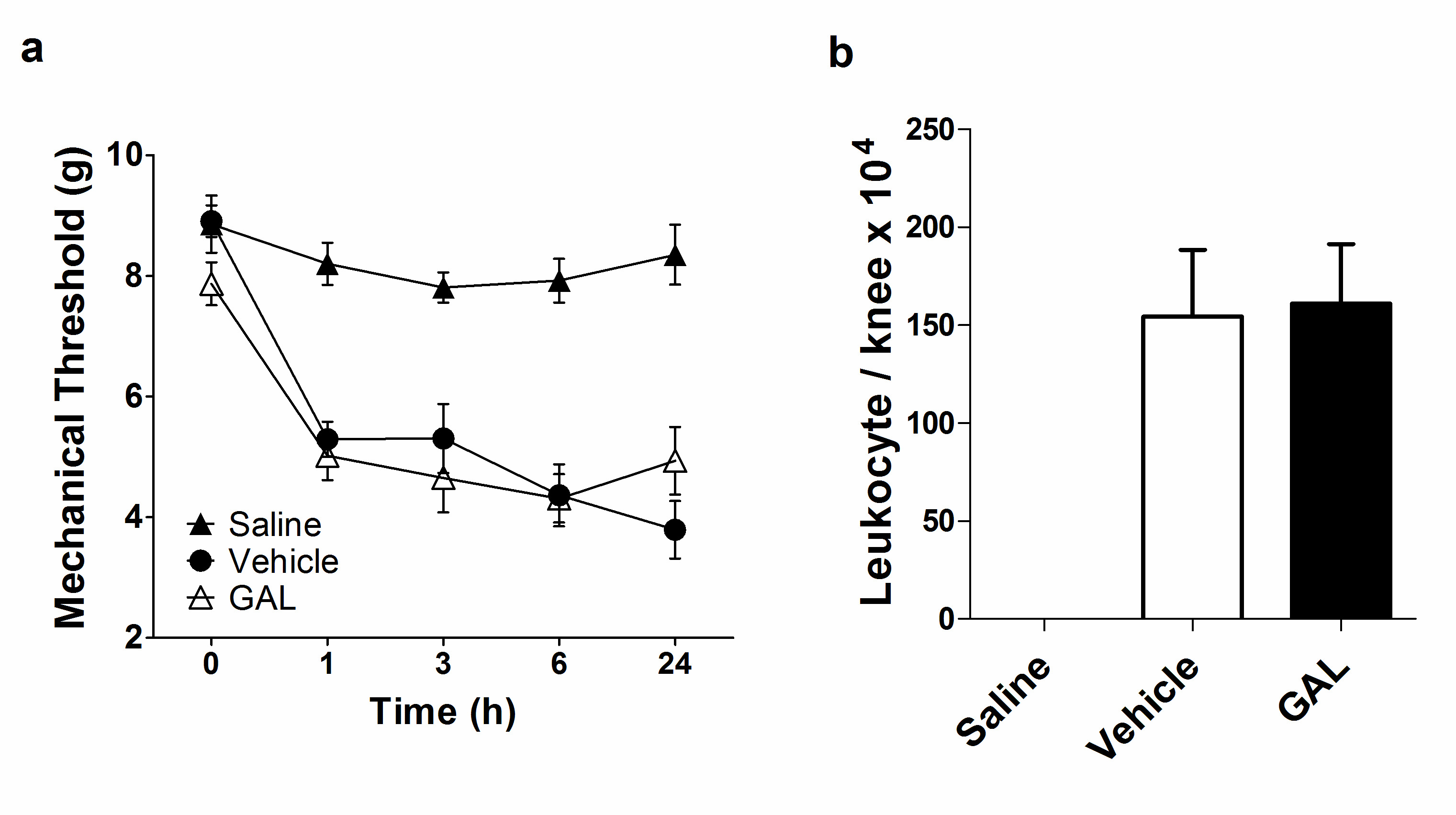 After the mBSA joint injection, the nociception of the knee joint was evaluated on 0, 1, 3, 6 and 24 h in AIA. Vehicle-treated mice had a significant increase in nociception since 1 hour after i.a injection and a larger increase at 24 h (3.793 ± 1.263 g) compared with the control group. This behavior indicates the efficacy of the inflammatory process induced by the mBSA challenge applied in this model. Likewise, The GAL-treated mice presented a similar nociception profile to the vehicle group (4.938 ± 1.584 g), however with a peak at 6 hour, followed by improvement at 24h, although without statistical significance (Figure 1a). Leukocytes migration induced by mBSA i.a injection was assessed in the knee joint after 24 h of monoarthritis induction, and both vehicle (154.4 ± 89.79 leukocytes/knee x 104) and GAL (161 ± 85.67 leukocytes/knee x 104) groups presented massive leukocytes migration (Figure 1b). The Saline group maintained stable nociception values and presented no leukocytes migration, indicating that there was no inflammatory process induced by i.a injection.