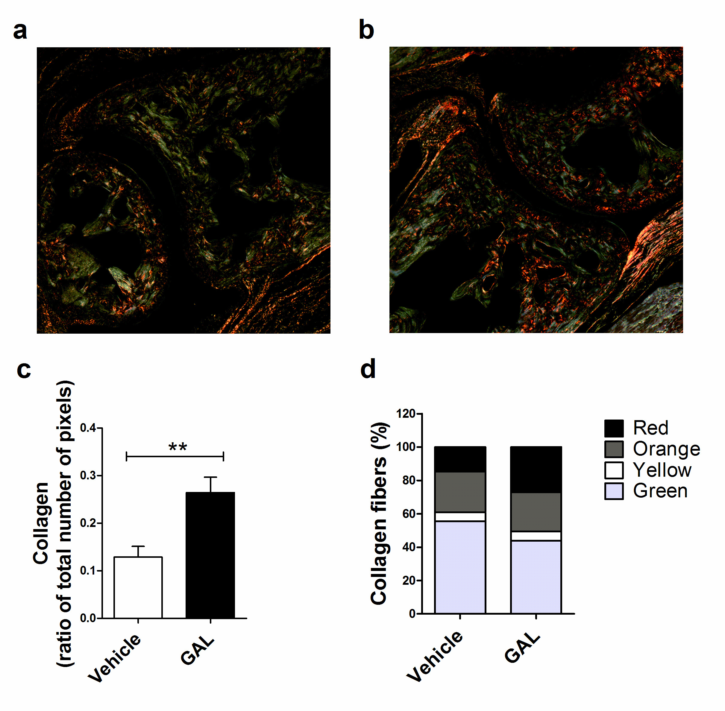 CIA development is marked by the release of metalloproteinases (MMPs), which results in the degradation of extracellular matrix components, like collagen [14]. Collagen can be observed by staining the tissue section with picrosirius red and, in addition, collagen fiber thickness can be assessed when observed with polarized light, since as fiber thickness increases, the color changes from green to yellow to orange and, finally, to red [21]. In this way, GAL-treated mice presented a higher amount of collagen (0.264 ± 0.073 pixels) in the ankle joint compared to vehicle-treated mice (0.128 ± 0.060 pixels) (p<0.01) (Figure 3a, 3b, 3c), decreasing the percentage of green collagen fibers (GAL: 43.8%; Vehicle: 55.5%) and increasing of red collagen fibers proportion (GAL: 27.2%; Vehicle: 14.8%) (Figure 3d).