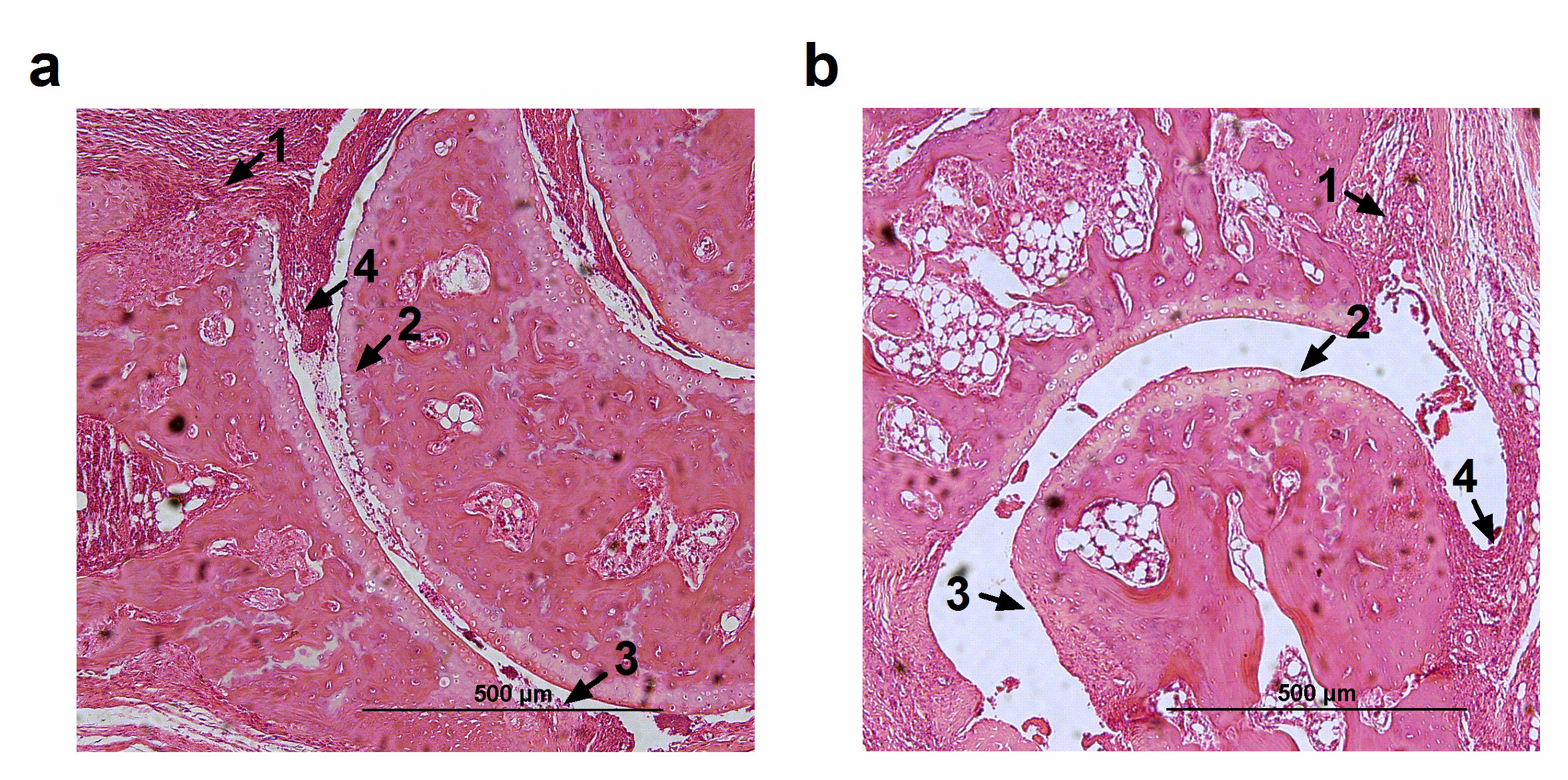Figure 4. Histopathology of ankle joints from mice with collagen-induced arthritis (CIA). (a) Vehicle-treated mice with CIA showed infiltration of inflammatory cells with pannus formation and large cartilage and bone erosion. (b) Treatment with galantamine did not improve histopathologic parameters of CIA. 1-Infiltration of inflammatory cells, 2- Cartilage erosion, 3- Bone erosion, 4- Pannus.