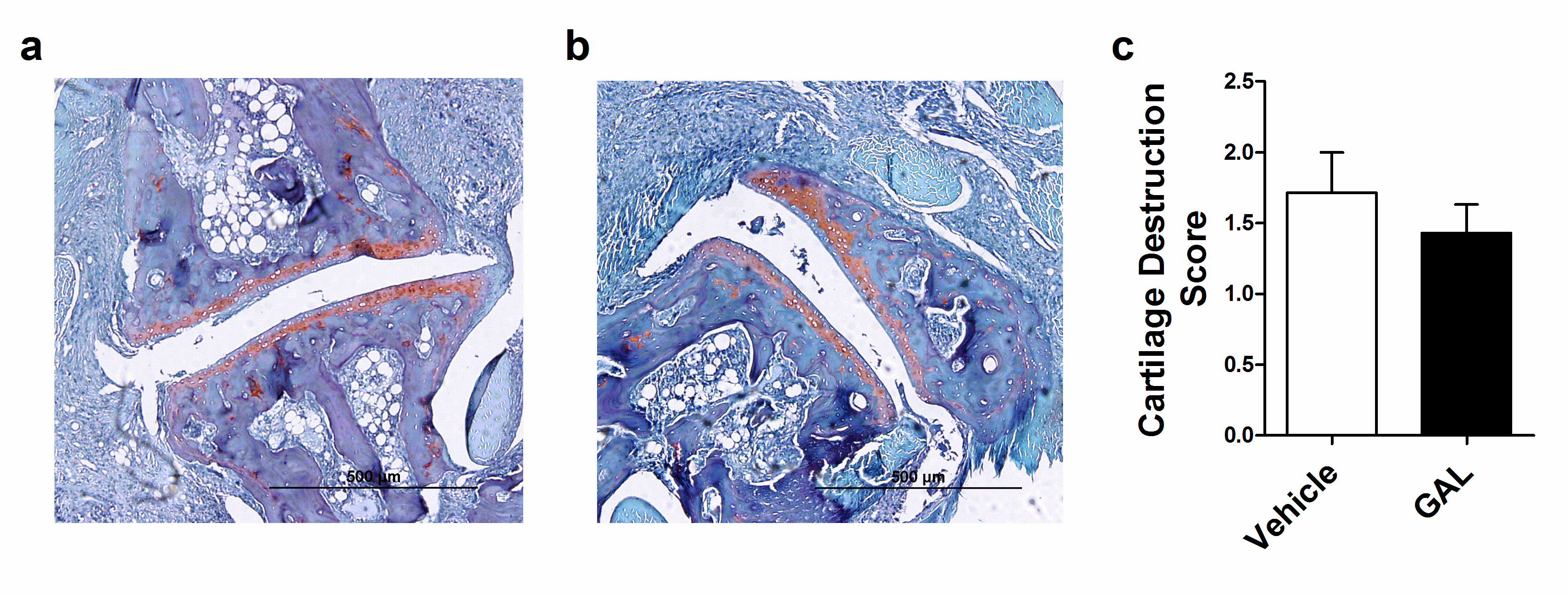 In HE analyses, vehicle-treated mice presented synovial inflammation, characterized by a great influx of inflammatory cells; an extended pannus formation and histological damage, characterized by large cartilage and bone erosion, without presenting synovial hyperplasia (Figure 4a). Beyond that, GAL-treated mice presented a similar histologic profile (Figure 4b), but bone erosion presented a no significant decrease in GAL-treated mice (Table 1). Additionally, the vehicle-treated mice presented mild cartilage destruction (Figure 5a), a feature that was not ameliorated by GAL treatment (Figure 5b, 5c).