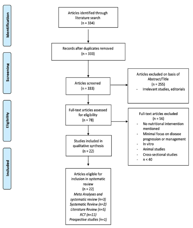 Results: Initially, 334 articles were identified. After removing studies for lack of relevance, exclusion criteria, and duplicates, 22 articles remained. The eligible articles were divided into five groups based on design: meta analyses, systematic reviews, RCTs, literature reviews, and prospective studies. The eligible articles were grouped together based on intervention type: diets, supplementation and the implementation of fruits and herbs. Five articles were placed under the category of diet which includes one systematic review, two RCT and two literature reviews.