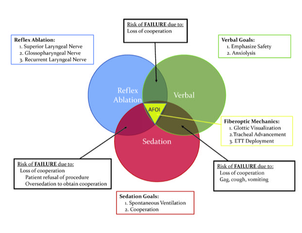 Once you have decided to perform an awake fiberoptic intubation and have discussed your plan with the patient, it is time to put all the skills together. The Venn diagram in Figure 1 illustrates how each aspect of the procedure overlaps to achieve a smooth and efficient fiberoptic intubation. Pitfalls are noted for when a key component is missing, such as losing cooperation from over-sedation or pushing through a gag reflex that has not been adequately ablated.