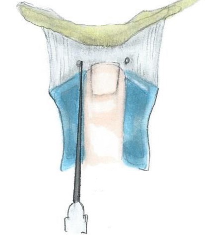 5. While standing on patient’s right side (if you are right-handed), gently palpate for the incisura with your left hand to perform the SLN block. Using a standard 10-cc syringe with a 23-gauge needle attached, hold the syringe ready to inject in your right hand and inject 3 cc of 2% lidocaine bilaterally into the THM just off your left index finger, the 1/3 approach. Consider 6 cc in the midline for smaller patients. The injection should be met with a little resistance, giving tactile feedback that the needle is positioned within the membrane and is not superficial to it. It is important to inject into the THM or the fat pad just deep to the THM in order to adequately soak the SLN. There should be 4 cc of lidocaine remaining in the syringe. Assess the patient’s sedation and give additional medication if needed.