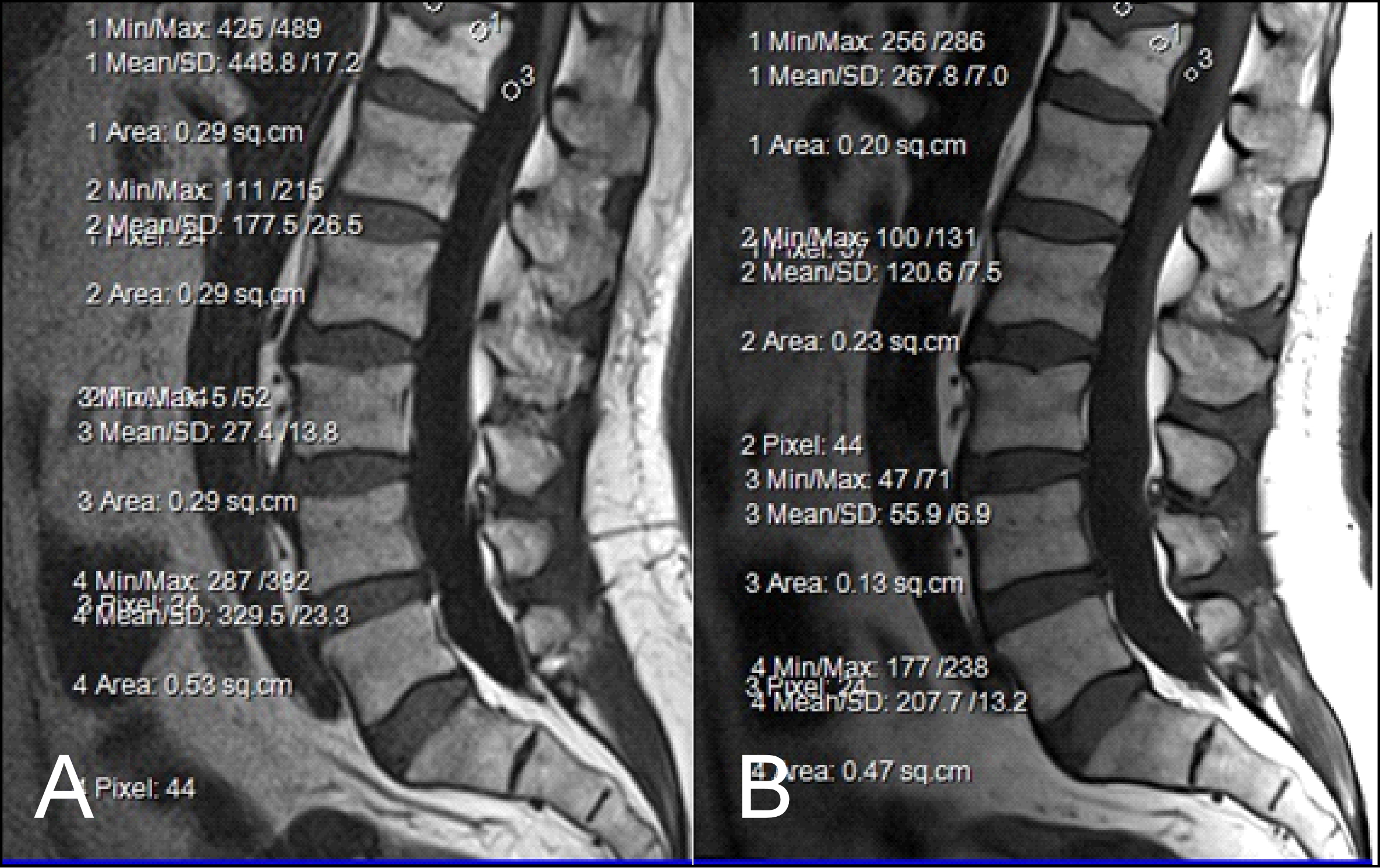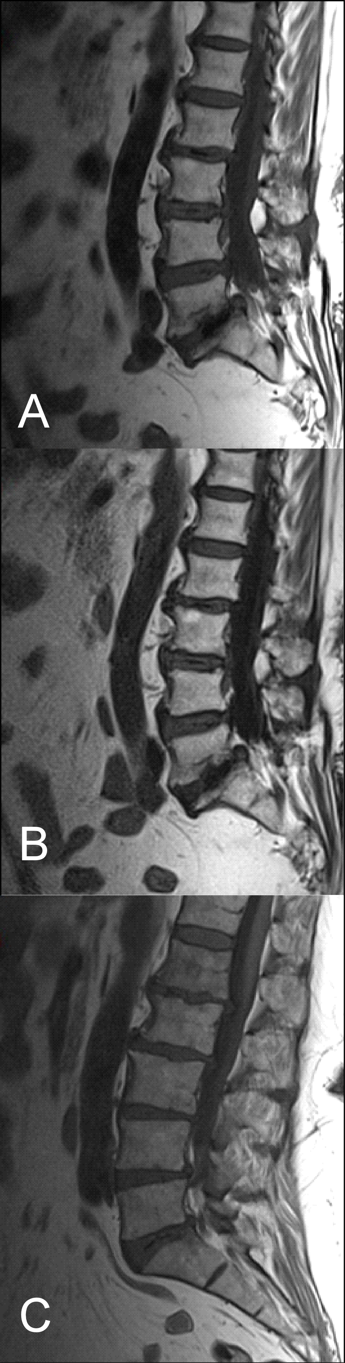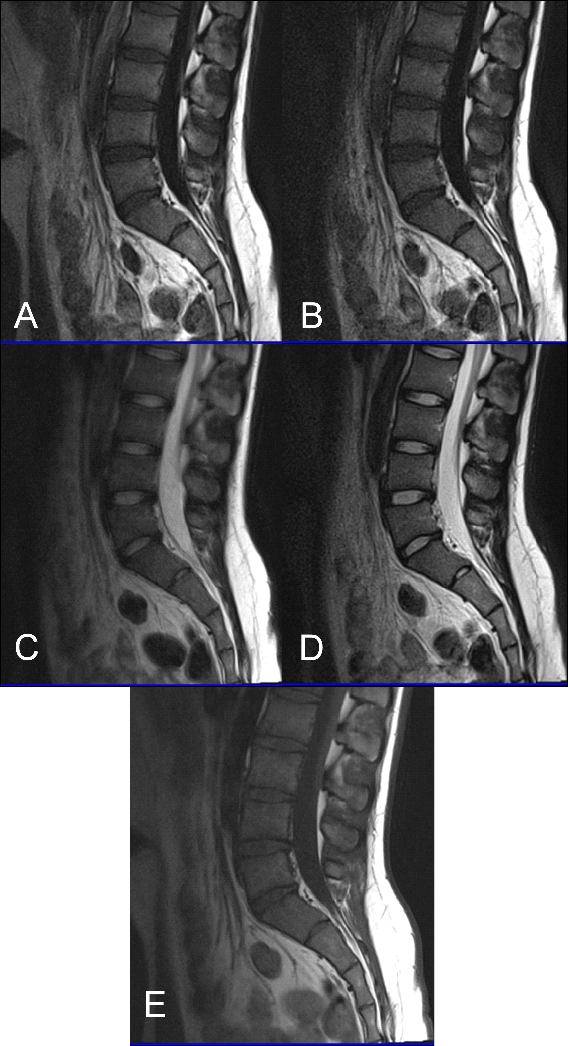 All the lumbar spine (L-spine) MRI examinations in this study were acquired on a 1.5T scanner (Magnetom, Avanto, Siemens Healthcare Sector, Erlangen, Germany) and a Synergy body phased-array surface coil. The parameters of each sequence are presented in (Table 1).
