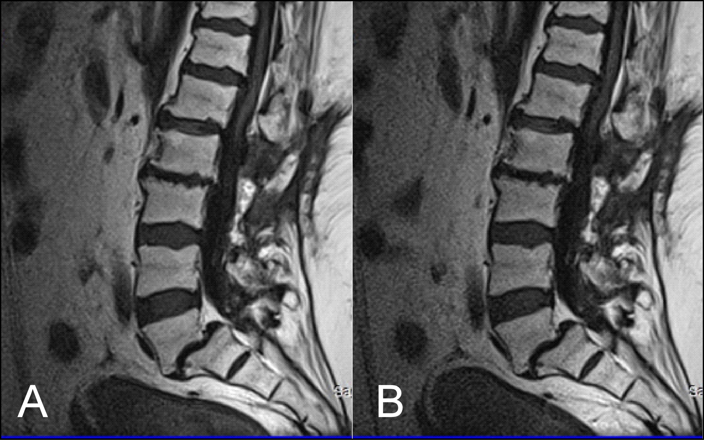 As stated earlier, sagittal T1 weighted images play an integral role in the MR imaging of the L-spine. One of the reasons is that they provide great information about anatomical structures. In order to assess the importance of the BLADE sequence compared to a TSE, both a qualitative and quantitative analysis were performed by evaluating contrast in between anatomical structures and the SNR, CNR and ReCon measurement respectively [18]. Although T1W-TSE is a faster sequence, T1W-FLAIR BLADE scored better in quantitative and qualitative analyses. Pathologies and abnormalities were better visualized in the latter one. Furthermore, in T1W-FLAIR BLADE there was improved image contrast as well as greater depiction of anatomical structures and either degeneration or metastatic lesions. Both the quantitative and qualitative analysis showed that T1W-FLAIR BLADE achieved better results than T1W-TSE. In addition to that, T1W-FLAIR BLADE images without parallel imaging were found to have better quality than the T1W-FLAIR BLADE images with parallel imaging. Although they both eliminated motion artifacts, the images without parallel imaging have better SNR as well as better contrast between tissues (Figure 3). Moreover, a study showed that T1W-FLAIR images can successfully eliminate chemical shift artifacts compared to T1W-TSE due to greater receiver bandwidth [8]. This statement was confirmed by our findings (Figure 4).