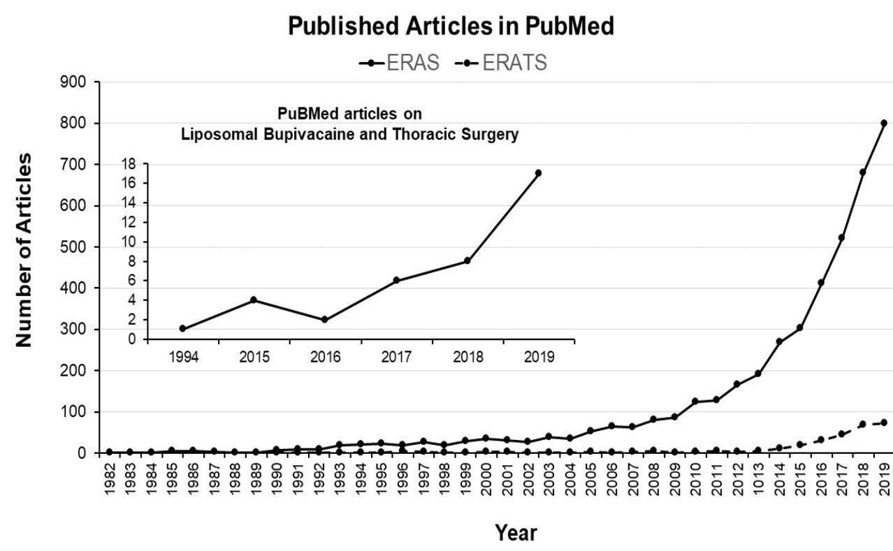 The ERAS concept, developed in early 2000’s by clinicians in Europe as a care protocol to address pre-, peri- and post-operative components of surgical patients with an overarching goal of achieving optimal postoperative outcomes, safe discharge while being cost-effective [14]. The principle of ERAS is the multidisciplinary, patient-centered approach to resolve issues that cause complications in order to accomplish quality post-operative recovery. This aim is achieved by systemically applying evidence-based practice, formatted into a care protocol with built-in frequent updates to optimize quality improvements. One important feature of ERAS is a built-in internal auditing process to ensure compliance and achievement of desired patient outcomes following implementation. ERAS has gained traction globally and is utilized by many surgical specialties including general thoracic surgery, which is exemplified by the exponential increase in the number of publications listed in PubMed (Figure 1).