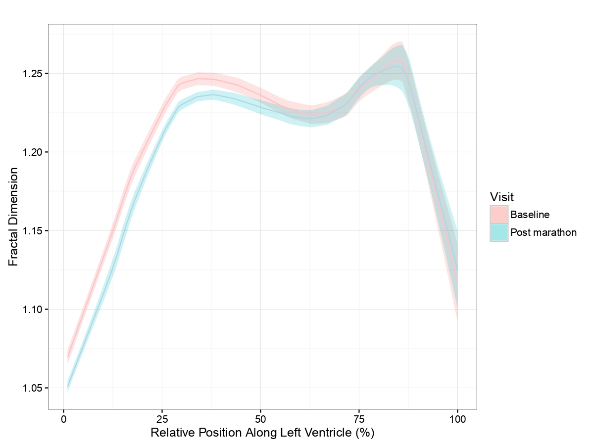 Figure 1: Mean fractal dimension across the entire left ventricle from base (0%) to apex (100%). Baseline (pink) and post marathon (blue) results are displayed together with the respective shaded regions representing 95% confidence intervals of mean values.