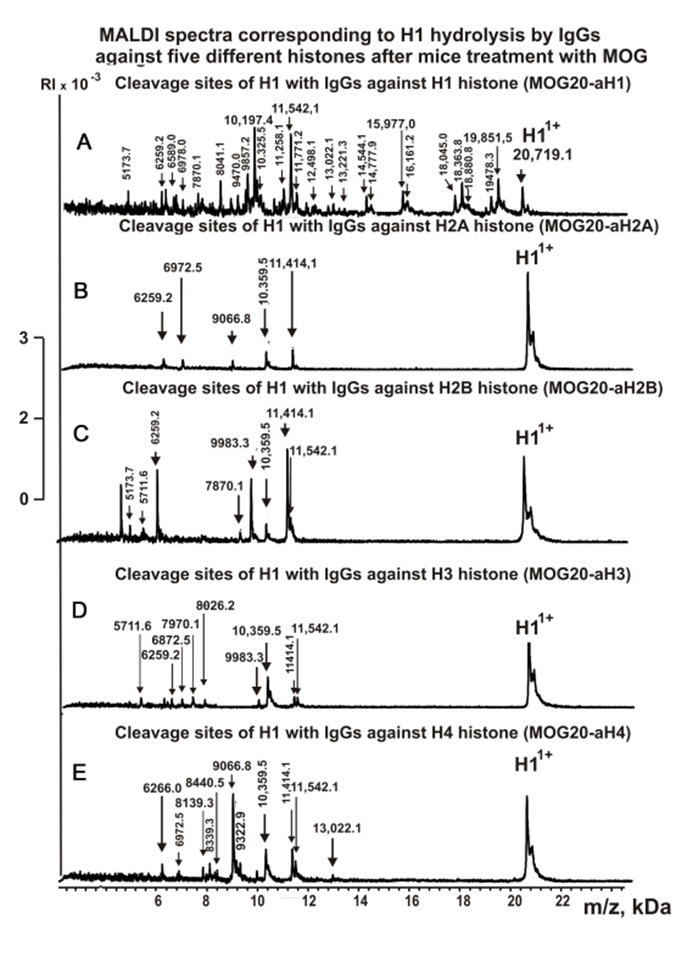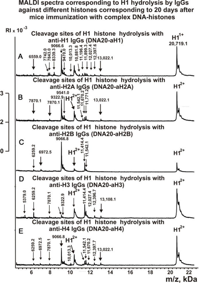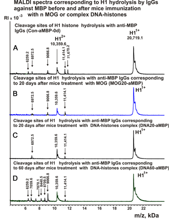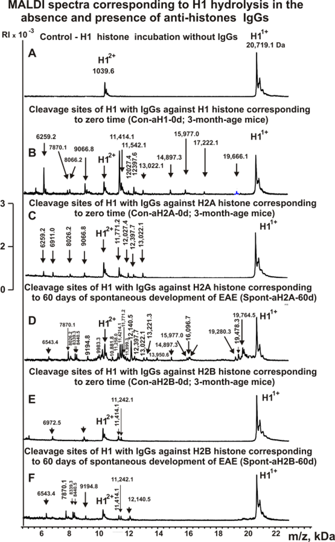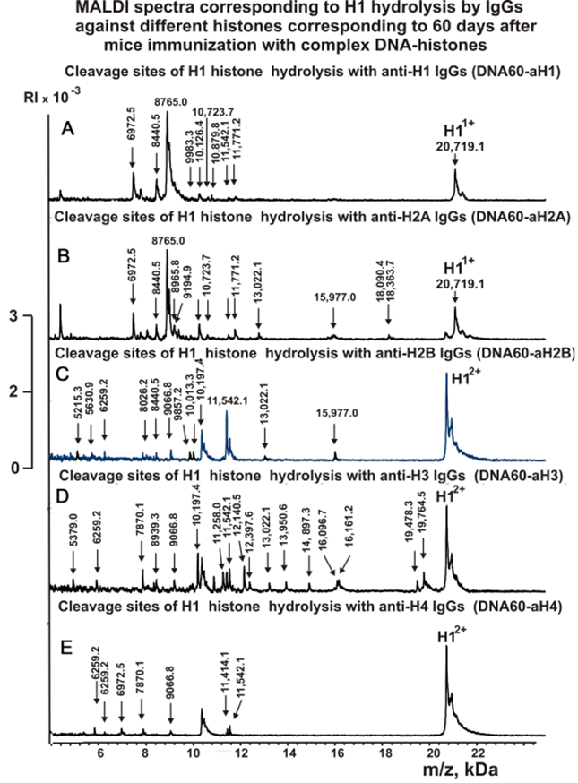 H1 histone was hydrolyzed during 0-20 h using all IgG preparations against MBP or 5 individual histones using conditions described above. The ascertainment of the H1 histone hydrolysis products was performed by the 337-nm nitrogen laser VSL-337 ND, 3 ns pulse duration of Reflex III system (Bruker Frankfurt, Germany). Small aliquots of reaction mixtures (1–2 µL) were used after reaction mixtures incubation at different times by MALDI mass spectrometry. Sinapinic acid was used as the matrix. To 1.7 µl of the matrixes and 1.7 µl of 0.2% trifluoroacetic acid, 1.7 µL of the solutions containing histone H1 were added, and 1.0-1.7 µl of the obtained mixtures were applied on the iron MALDI plates. For the analysis, they were air-dried. All MALDI spectra were calibrated using standards II and I calibrant mixtures of special oligopeptides and proteins (Germany, Bruker Daltonic) in the external and/or internal calibration mode. The analysis of molecular weights and specific sites of H1 hydrolysis by various IgGs was done using Protein Calculator v3.3 (Scripps Research Institute).