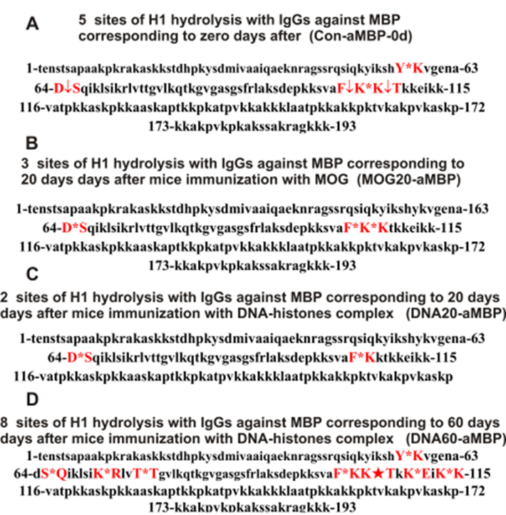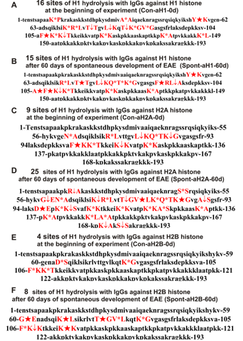 Conclusion: Generally, it first demonstrated that at different stages of EAE evolution, IgG-abzymes against individual histones and MBP could significantly differ in specific sites and their number of H1 hydrolysis. Possible reasons for the catalytic cross-reactivity and strong differences in the number and type of cleavage sites are discussed.
