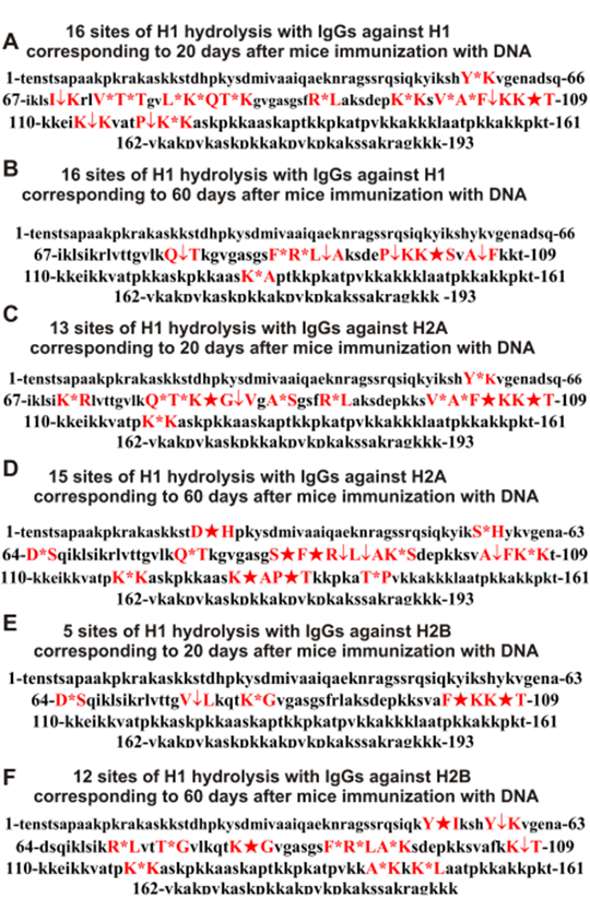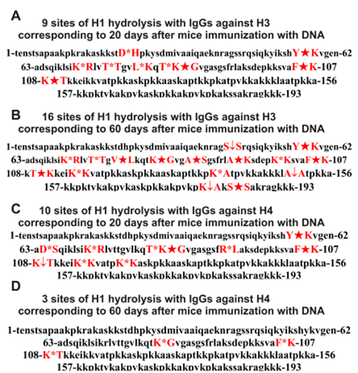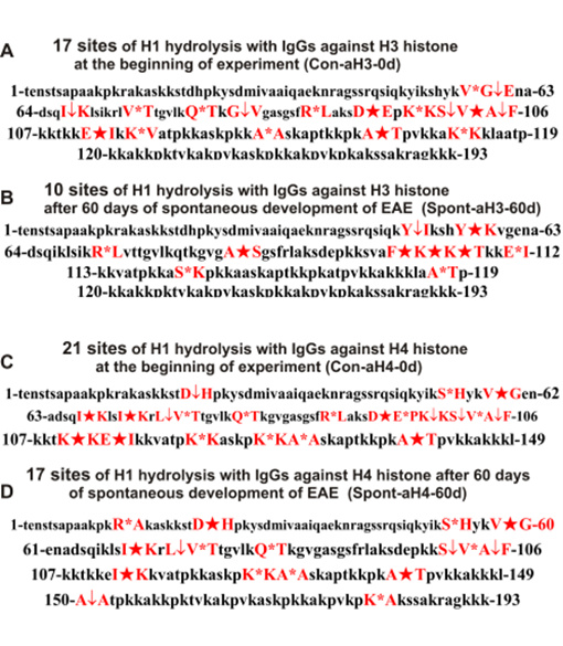 As it is known that the formation of natural Abzs occurs against specific structures of different molecules, imitating, at least to some extent, the transition states of chemical reactions [17-23]. In principle, Abzs could be formed in the case of different antigenic determinants or protein sequences that mimic the transition state of a peptide bond hydrolysis reaction. At various stages of EAE achievement, each of the five histones and their complexes with each other, or with DNA or other different molecules or cells, could represent different fragments of protein sequences that mimic the transition states of hydrolysis of bonds between AAs for the formation of Abzs. Moreover, all these substrate-molecules and their various associates at different stages of EAE achievement could form various complexes with different proteins, lipids, oligosaccharides, etc., which can lead to the formation of specific protein determinants and the formation of some new sequences imitating transition states. This might be one of possible reasons for the formation of very different abzymes hydrolyzing H1 at different sites corresponding to various stages of EAE development.