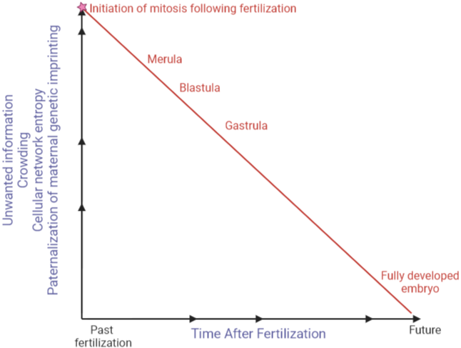 Figure 2. Dramatic increase in cellular network entropy of fertilized ovum triggers mitosis. At the time of fertilization, crowding happens and massive amount of unwanted information also enters ovum. Recurrent rounds of mitosis [embryogenesis] aims at maternalization of paternal genetic Imprinting and massive organization, i.e. significant decrease of cellular and organism networks entropy.