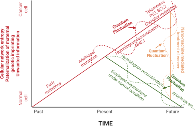 Figure 3. Normal mechanisms employed in reversal of neoplastic transformation and their breakdown leading to full blown neoplastic transformation. Quantam flucation refers to a non-smooth path, based on quantam nature of living cell. Nano machines could get designed in a diverse group of ways, to acheive the task of reversal or freeze of the evolutionary forward move of tumor mass.