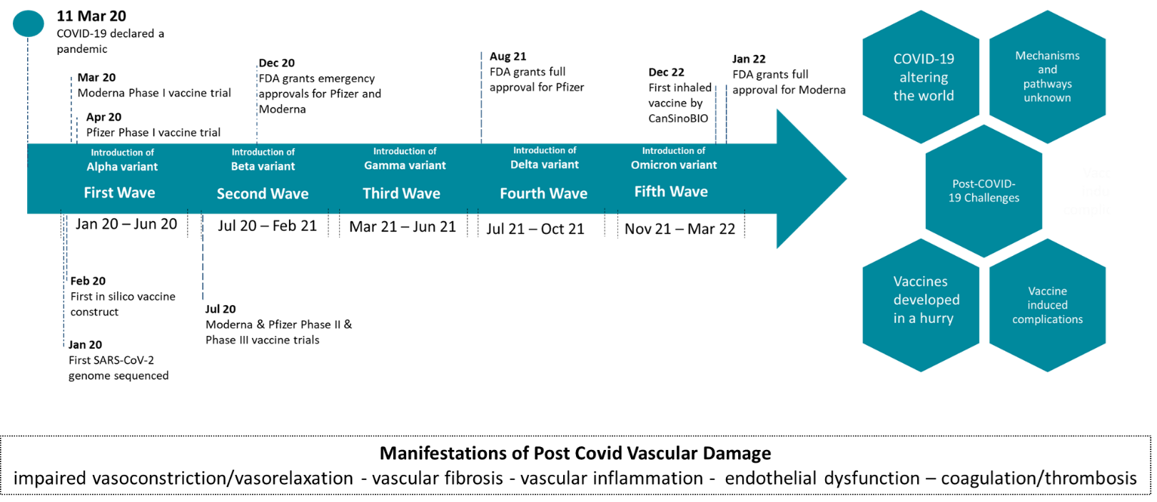 Figure 1: Timeline of COVID-19 progression and vaccine development [49-51]. The Figure shows post-COVID-19 associated challenges and highlights the need for molecular and pathway studies.