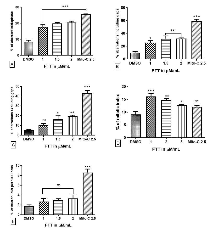 Figure 3. Occurrence of cytogenetic toxicity at different concentration of FTT after 24 hrs post-treatment with in CHO-K1 cells; (A) percentage of aberrant metaphases; (B) total number of aberrations including gaps; (C) total number of aberrations excluding gaps; (D) mitotic index (E) induction of micronucleus *** P<0.001; **P<0.01; *P<0.05 compared to vehicle control (DMSO).