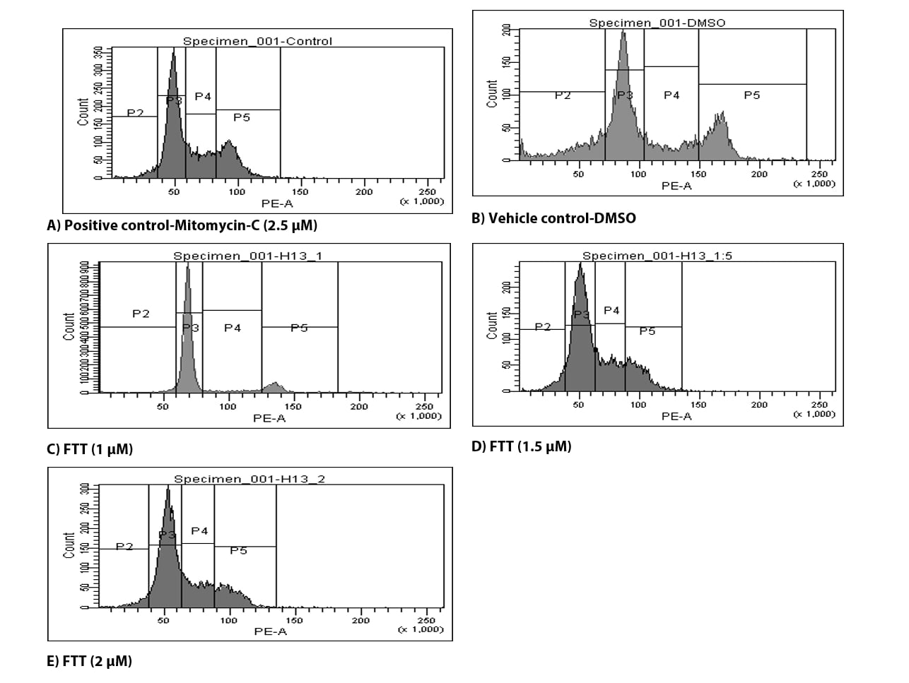 We investigated the effects of three selected sub-toxic concentrations of FTT on the regulation of cells at different phases of the cell cycle. Table 4 and Figure 4 show the typical cell cycle distribution of CHO-K1 cells with DMSO; representing4% of cells in Sub-G1 phase. Interestingly CHO-K1 cells with three test concentrations of FTT (1 µM, 1.5 µM and 2 µM) resulted in more or less equal percentage of cells in Sub-G1 with 4.3 %, 5.3 % and 4.4 % respectively. It was understood that the percentage of cells driven into apoptosis was negligible by FTT and the compound was minimally toxic. Whereas, high population of cells was found to block in G1/G0 phase, by all three tested concentrations of FTT when compared to that of vehicle control DMSO. This presence of high population of cells in G1/G0 phase and corresponding decrease of cells in following S and G2/M phases suggests that the compound caused G1 arrest and ceased the DNA synthesis of affected cells.