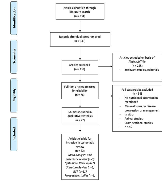 Results: Initially, 334 articles were identified. After removing studies for lack of relevance, exclusion criteria and duplicates, 22 articles remained. The eligible articles were divided into five groups based on design: meta analyses, systematic reviews, RCTs, literature reviews, and prospective studies. The eligible articles were grouped together based on intervention type: diets, supplementation and the implementation of fruits and herbs. Ten articles were placed under the category of supplementation which includes three Meta analyses, one systematic review, four RCT and two literature reviews.