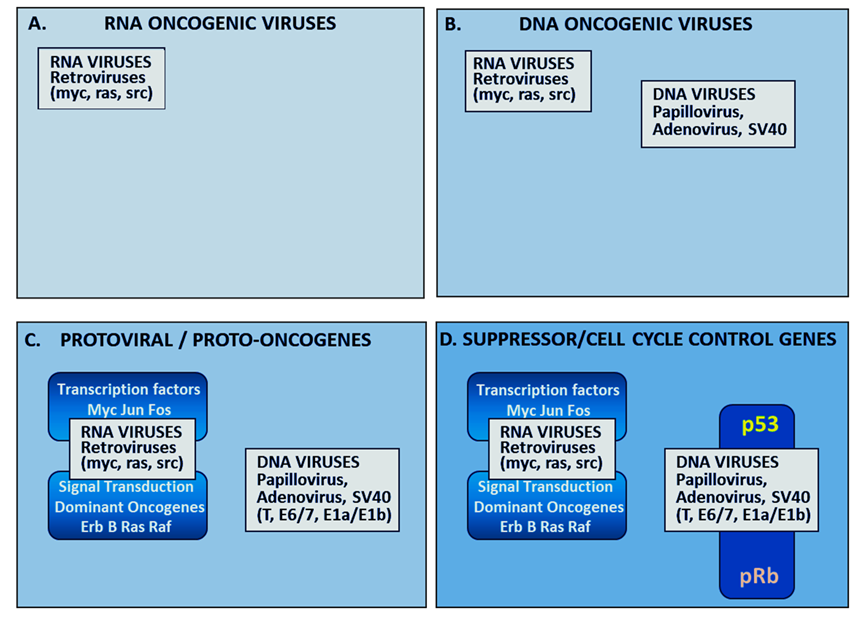 Figure1.Schematic representation of the evolution of understanding of the molecular biology of cancer. The first RNA oncovirus was discovered by Peyton Rous in 1911 (Panel A). Oncogenesis by DNA adenoviruses and polyoma virus causing cancer in animals were discovered in the 1950s (Panel B). In the 1970s and early 1980s, RNA viruses were shown to parallel the activity of mutated somatic oncogenes causing autonomous upregulation of somatic signal transduction and transcription factors (Panel C). The action of oncogenic DNA viral antigens: papilloma E7, SV40 T and adenoviral E1Aa/E1b in blocking p53 and pRb tumour suppressor genes (Panel D) has been reviewed by Weinberg in 1994 [18].