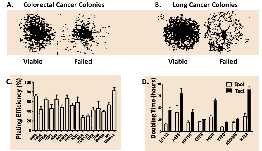 Figure 2. In vitro studies showing spontaneous cell death of untreated control cultures of Human Cancer Cells. Composite slide from previously published data [24]. Panels A and B show aborted colonies adjacent to successful viable colonies in untreated cultures of the SW20 colorectal and H460 non-small cell lung cancers grown under optimal tissue culture conditions at 15 days after plating single cell suspensions. Panel C. The plating efficiencies of 16 untreated cultures (H460, HELA, HT29/5, HEP2, A519, A431, HRT18, RT112, H322, MOR, COR-L23, OAW, 2780, SW620, KB, MGHU1) yield plating efficiencies between 30% and 80% (means + SE). The morphological appearances of dying cells were not consistent with apoptosis and were related to a change in the ratio of Cdk4 to Cdk1. Panel D. Spontaneous cancer cell death confirmed by flow cytometric comparison of potential and actual doubling times in eight of human cancer cell lines.