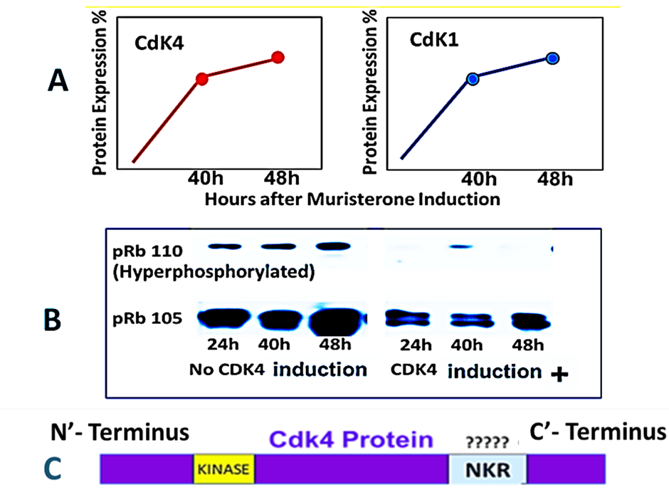 Figure 3. Cdk4 transfection of 2780 human ovarian cancer cells cause co-elevation of Cdk1 without retinoblastoma phosphorylation suggesting a possible non-kinase functional region in Cdk4. Composite data from Warenius et al. [46]. Panel A: Endogenous Cdk1 follows a similar time course and increase in proteomic expression as exogenous Cdk4 induced by 1 μM muristerone in 2780 pvrg-pINDK4 clone 1D cells. Panel B. Western blotting for total retinoblastoma protein (pRb 105) and hyperphosphorylated retinoblastoma protein (p110) following exposure of 2780 pvrgpINDK4 clone 1D cells to 1 μM muristerone. Panel C. Schematic presentation of originally proposed functional non-kinase region (NKR) unique to Cdk4.