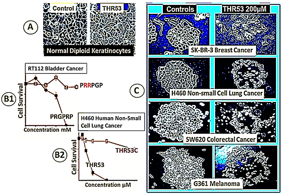 Figure 4. Comparative effects of PRGPRP and THR53 on human cancer cell lines of different histological subtypes in human in vitro cancer cell lines compared to normal diploid human keratinocytes. Panel A. Primary cultures of explanted human keratinocytes with and without exposure to THR53. Panel B. Cancer cell necrosis following exposure to PRGPRP and THR53 does not occur when the relative positions of the arginines is altered as in PRRPGP and THR53C. Panel C. Different histological types of cancer die with closely similar morphological appearances after exposure to the same dose of THR53. Composite presentation from data described in Warenius et al. [46].