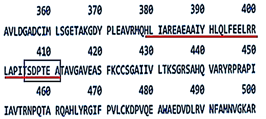 Figure 5.Linear amino acid sequence of the tetramerisation region of Pyruvate Kinase M2. The amino acid sequence of the peptide region contained within the tetramerisation interface between amino acid residues 378 and 411 is underlined in red. SDPTEA, the putative target for PRGPRP at amino acid residues 406 -411, is included by the rectangular box. Data extracted from the UniProt Blast (TrEMBL) amino-acid sequence of human PKM2.