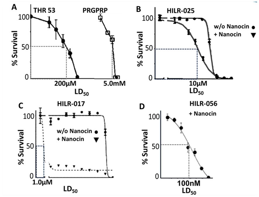 Figure 6. Cell survival curves showing LD50 values for H460 human non-small cell lung cancer following exposure to PRGPRP and congeners of increasing specific activity. Panel A data from Warenius et al. [46]. Panels B and C unreported data published in EU granted patent 428998EP. Panel D. Previously unpublished data. Peptide structures: THR53: Cyc[Pro-Arg-Gly-Pro-Arg-Pro-Val-Ala-Leu-Lys-Ala-Leu-Lys-Ala-Leu] HILR-025: Cyc[Pro-Arg-Sar-Pro-Arg-Pro-Val-Tryp-Tryp-Arg-Arg-Tryp-Tryp-Arg-Arg Tryp-Tryp-Arg-Arg]; HILR-017: Cyc[Cys-Dac-Arg-Sar-Nap-Arg-Nap-clips-Cys] HILR-056: Cyc[CycDac-Arg-Sar-Nap-Arg-Na-Val-Tryp-Tryp-Arg-Arg-Tryp-Tryp-Arg-Arg].