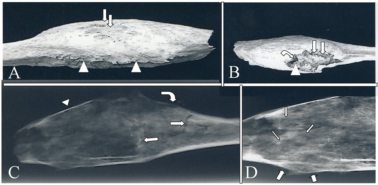 Figure 1: Resected fibula with telangiectatic osteosarcoma. A. Lateral macroscopic view of expanded distal fibula. Arrows identify areas of cortical breakthrough. Arrowheads identify slight focal periosteal reaction. B. Medial macroscopic view of expanded distal fibula. Straight arrows identify post-mortem damage. Curved arrow identifies indistinct trabeculae. Arrowhead identifies cystic area. C. Lateral x-ray of expanded distal fibula. Straight arrows identify fracture lines. Curved arrow identifies focal periosteal reaction. Arrowhead identifies severe cortical thinning. D. High contrast, closeup view of C. Thin arrows identify subtle cystic areas. Thick arrows identify periosteal reaction with a Codman’s triangle.