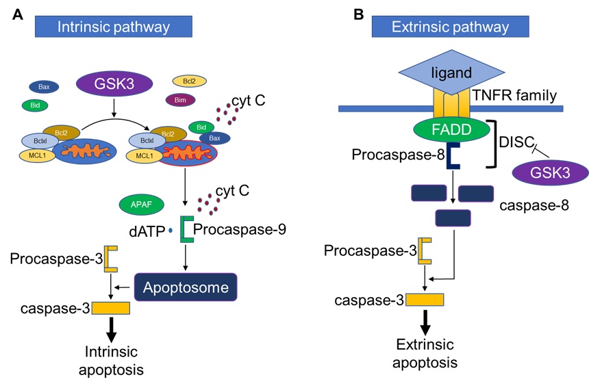Figure 2: GSK3 has opposite effects in the intrinsic and extrinsic apoptotic pathways.