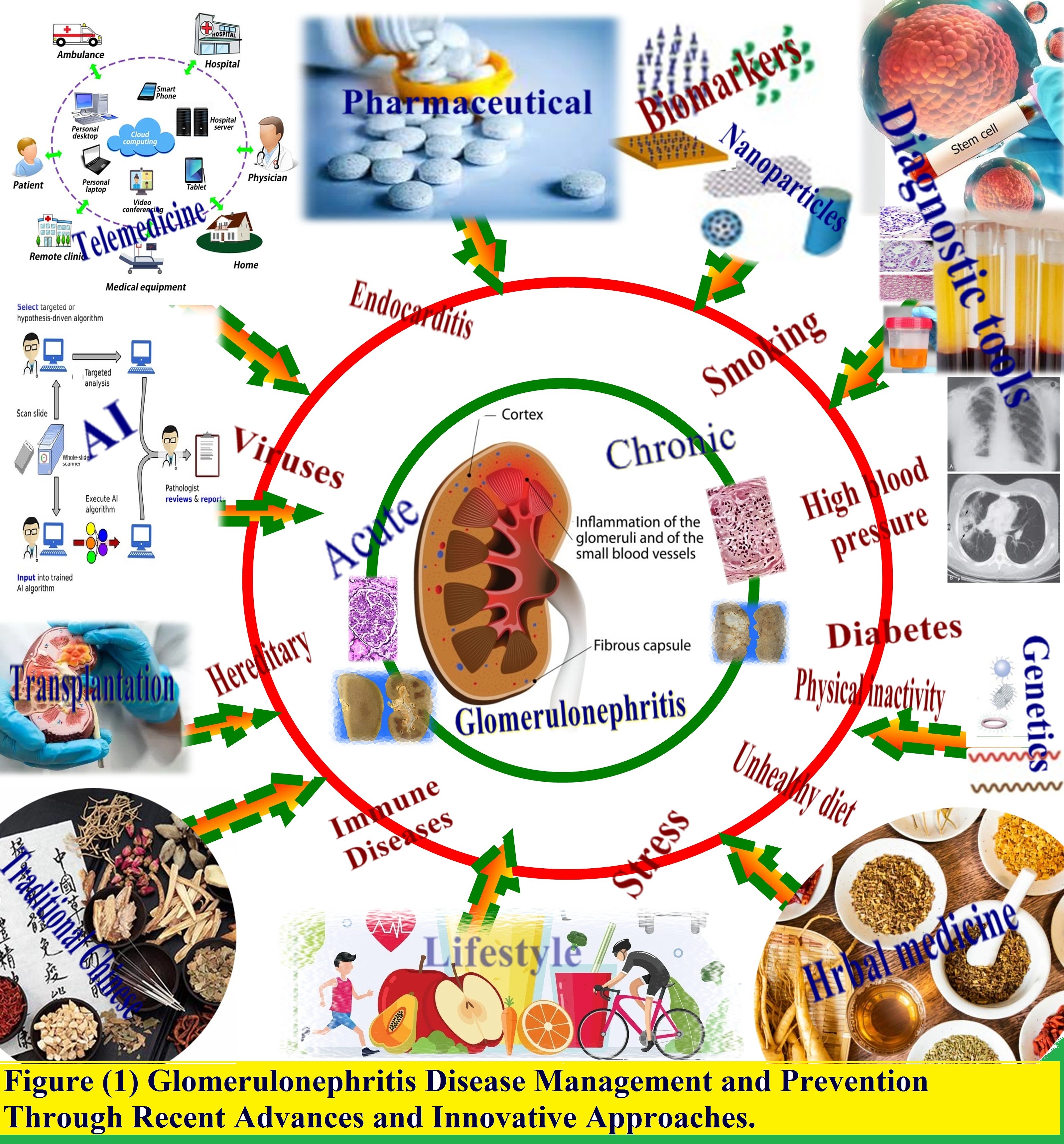 Glomerulonephritis refers to inflammation and injury of the glomeruli, the tiny filtration units within the kidneys. It can arise from various causes like infections, autoimmunity, and genetic factors, and may be acute or chronic [1]. Symptoms include blood and protein in the urine, high blood pressure, and swelling, though manifestations differ. Diagnosis involves exams, lab tests, and imaging studies. Treatment targets the underlying cause, controls symptoms, and prevents complications. Severe disease may require kidney transplant [2]. Glomerulonephritis can lead to chronic kidney disease, end-stage renal disease, and cardiovascular issues, severely impacting health. Thus, effective prevention and management is crucial, through addressing underlying causes, minimizing risks, and adopting healthy lifestyles [3-6]. Recent advances provide new possibilities, including discovering novel biomarkers, imaging techniques, and personalized medicine, plus exploring artificial intelligence, nanotechnology, and stem cell therapy [7].