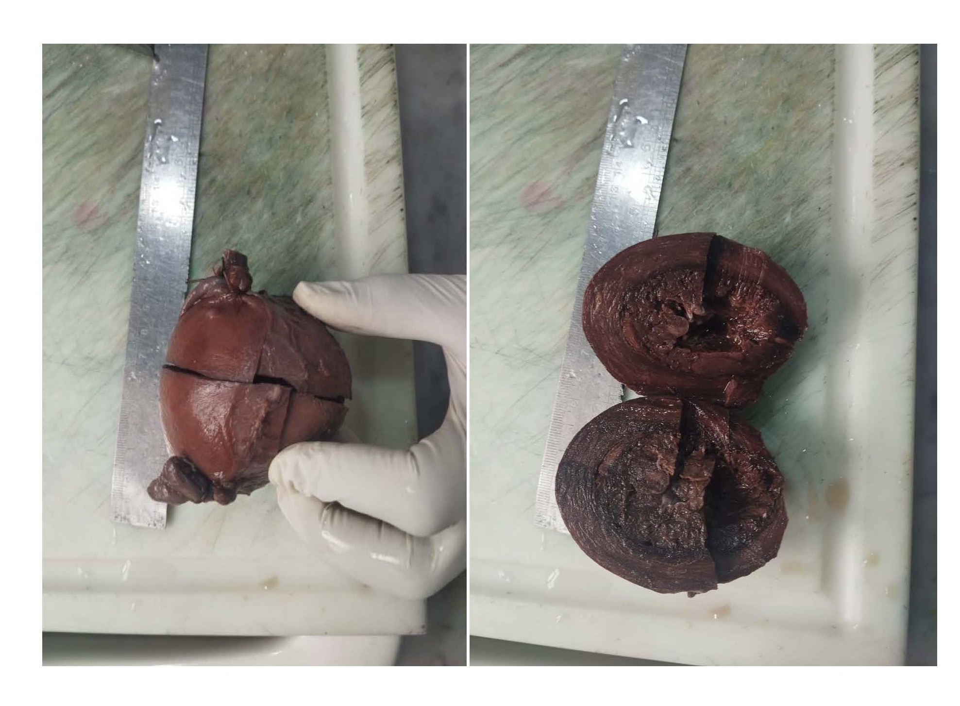Figure 1. Gross surface and cut section of the uterus, respectively.