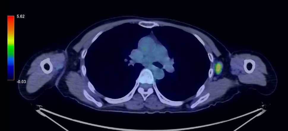 Figure 3. PET/CT scan showing a left axillary lymph node with a maximum standard uptake value of 3.7. No accumulation is seen in other organs.
