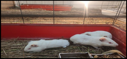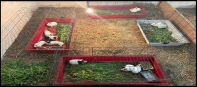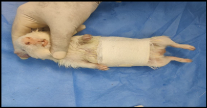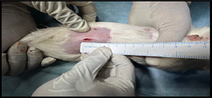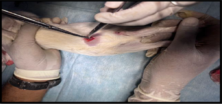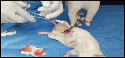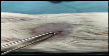 Healthy guinea pigs were selected and divided into five groups of five animals each. They were fed a standard laboratory diet throughout the study (Figure 1). Abdominal hairs of the guinea pigs were clipped, and surgical procedures were performed under local anaesthesia using lignocaine (4 mg/kg) after scrubbing the dorsal area with an antiseptic solution under strict aseptic precautions (Figure 3). A median incision of 01 cm (Figure 4) was made on the abdomen, and a subcutaneous pocket (Figure 5) was created. Specific suture material (silk, polypropylene, polyamide, polyglactin) was sutured to the subcutaneous tissue in the pocket created (Figure 7), with five animals in each group. Closure of the skin was done using staplers and sterile dressing applied (Figures 11 and 12). A control group of five animals had no intervention, where subcutaneous pocket was created, and no sutures were placed. Skin was closed with staplers and sterile dressing done (Figures 11 and 12). Staples were removed on the seventh day.