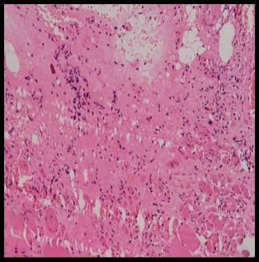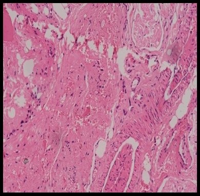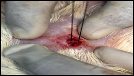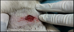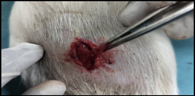 Any major complications of wound healing were checked, particularly within the first 7 days post-surgery. The study evaluated wound healing over 21 days and biopsy of the suture site was taken at three weeks post-procedure. Similar 1 cm incision was given at previously operated site and excision biopsy was taken from subcutaneous tissue (Figures 16 and 17). Assessment was done using light microscopy for histopathological examination. Tissue reactions next to the sutures were evaluated for the intensity of inflammatory cells, neovascularization, and fibrosis formation. Mt stain (Masson's trichrome) was used for microscopy study. Data were collected through digital photographs of the wound and histopathological examination then entered on excel sheet for analysis.
