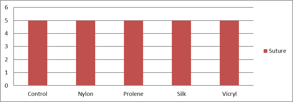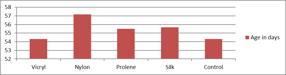 A total of 25 animals were included in the study. The mean age (in days) was 54.34. In the vicryl group the mean age was 54.33, 57.17 in nylon group, 55.50 in prolene group, 55.67 in silk and 54.33 in control groups. They were statistically insignificant with p value of 0.97 (Table 2).