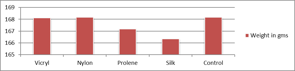 The mean weight (in gms) was 167.73. The mean weight was 168.17 in vicryl, nylon, and control groups, 167.17 in prolene group, and 166.33 in silk (Table 4). They were also statistically insignificant with p value of 0.96.