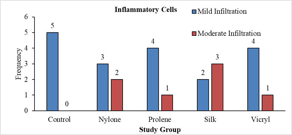 Table 5 illustrates the distribution of study groups based on the presence of inflammatory cells, with a total sample size of 25. The nylon group had 60% mild infiltration and 40% moderate infiltration, while the prolene group showed 80% mild and 20% moderate infiltration. The silk group presented 40% mild and 60% moderate infiltration, and the vicryl group had 80% mild and 20% moderate infiltration. The Chi square test was applied to test the statistical difference in proportions, yielding a p value of 0.271, indicating no significant difference in the presence of inflammatory cells among the study groups.