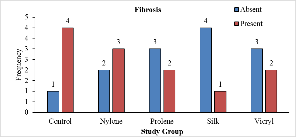 Table 7 shows the distribution of study groups based on the presence of fibrosis, with a total of 25 animals. In the control group, 20% of the animals showed an absence of fibrosis, while 80% showed its presence. The nylone group had 40% of animals without fibrosis and 60% with fibrosis. In the prolene group, 60% were without fibrosis and 40% had fibrosis. The silk group had 80% of animals without fibrosis and 20% with fibrosis. Lastly, the vicryl group showed 60% of animals without fibrosis and 40% with fibrosis. The chi square test for statistical difference in proportions resulted in a p-value of 0.384, indicating no significant difference in the presence of fibrosis among the study groups.