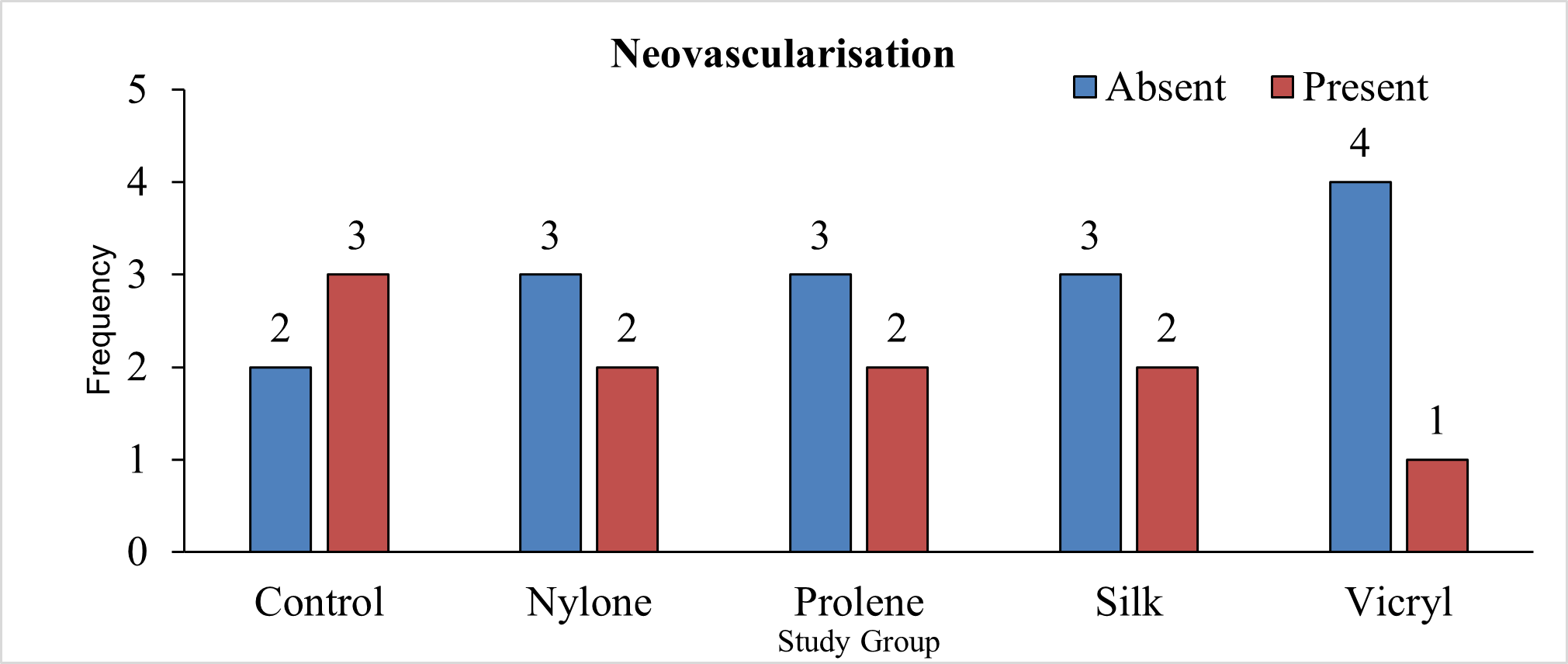 Neo vascularization, an essential component of wound healing, was observed in all groups. Vicryl group exhibited 80% of animals without neovascularisation and 20% with neovascularisation. In the control group, 40% of animals showed no neovascularisation, however, was seen in 60% (Figure 22). The nylone, prolene, and silk groups each had 60% of animals without neovascularisation and 40% with neovascularisation. However, these variations were not statistically significant (P=0.797) (Tables 9 and 10).