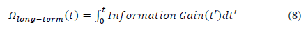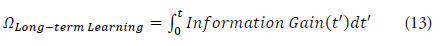 The evaluation of long-term learning at time t, denoted as Ωlong-term(t), is defined as the time-integrated information gain: