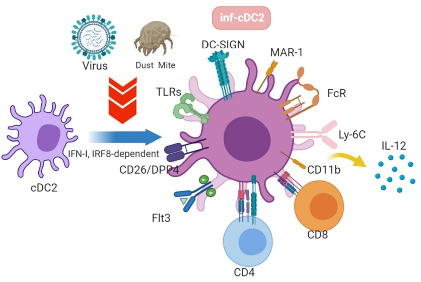 Figure 2: cDC2s in steady state are developed into inflammatory cDC2 upon TLR-activation by viral or dust stimulation depending on type 1 interferon and IRF8-dependent signaling. Activated inf-cDC2s migrate to the infected tissues, uptake antigens via Fc receptor, present antigens to CD4 and CD8 T cells, and produce IL-12 cytokine to initiate the cascade immune responses.