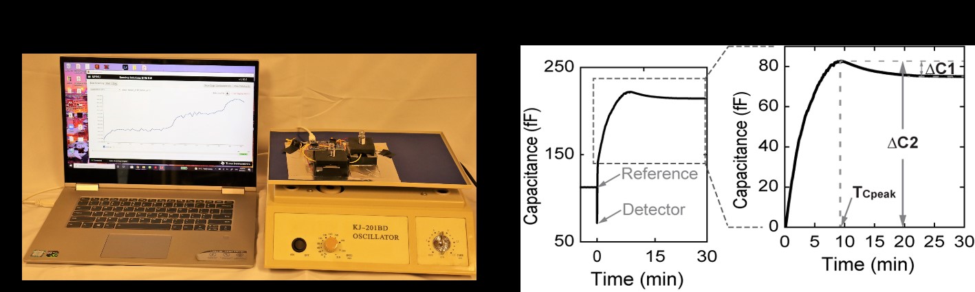 Figure 1: (a) Bench-top prototype of the hemostasis analyzer (b) Left: A representative overall capacitance signal for a blood sample activated using CaCl2 (12.5 mM). Right: Zoom-in view of the region of interest with the sensing parameters, TCpeak, ΔC1, and ΔC2 for analyses using the presented system.