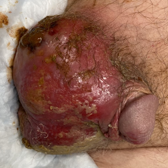 The scrotum was packed with betadine-soaked gauze, and the patient underwent daily dressing changes (Figure 1c). He endured an uncomplicated post-operative course and returned to his nursing home on post-operative day 10 with home wound care.
