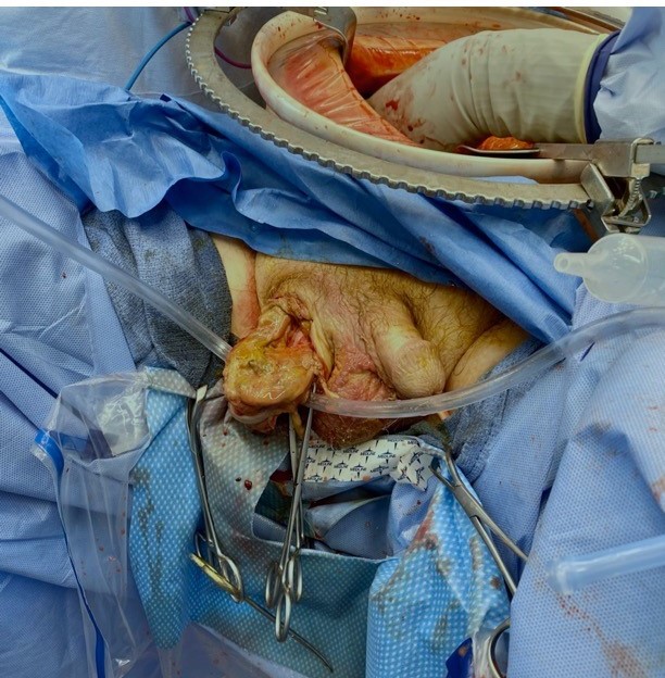 When he presented to the emergency department two weeks later with stool draining from the left side of his scrotum, his vitals were notable for tachycardia and a leukocytosis of 25.4. On physical exam he was drowsy secondary to septic shock. His abdominal exam revealed peritonitis and a small hole in the left scrotum was seen which had surrounding erythema and was actively draining stool. He was immediately begun on broad spectrum antibiotics and taken emergently to the operating room.
