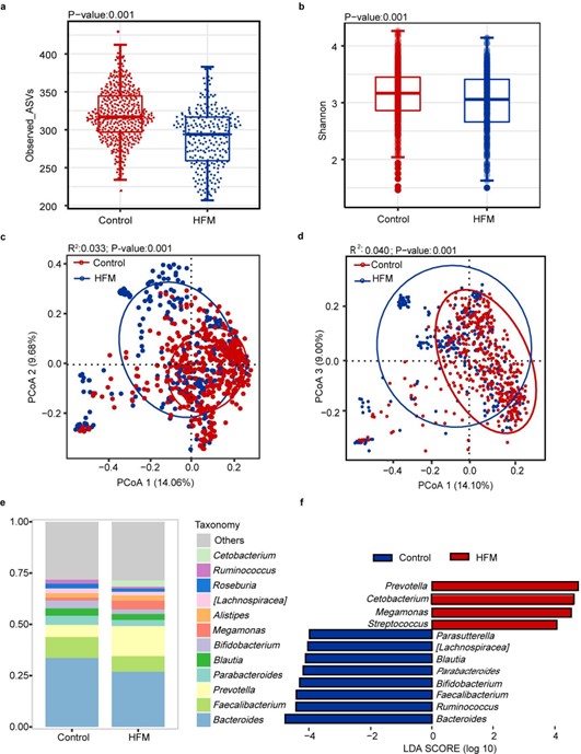 Figure 1. Comparison of the gut microbiota profile between HFMD and control groups. (a,b) Alpha diversity. Comparison of the diversity of high-abundant bacteria (the Shannon and Simpson indices) in the two groups (P<0.05, Wilcoxon rank-sum tests). (c,d) Beta diversity. Principal coordinate analysis based on bray-curtis distance and unifrac distance showing patterns of separation in the bacterial communities between the two groups. PCoA1, PCoA2, and PCoA3 represent the top three principal coordinates, and the explanation of diversity is expressed as a percentage. Each point represents a single sample and is colored based on the group. (e) Average relative abundance of the predominant bacterial taxa in each group at the genus level. (f) Linear discriminant analysis effect size (LEfSe) analysis. Differential bacterial taxonomy abundance between the groups (LDA>2).