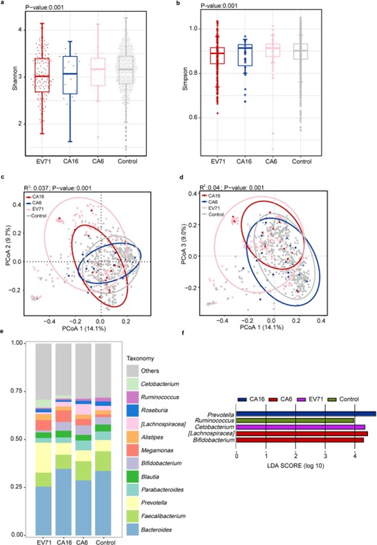 Figure 2. Comparison of the gut microbiota profile between EV71, CA16, CA6 and control groups. (a,b) Alpha diversity. Comparison the diversity of high-abundant bacteria (the shannon and simpson indices) among EV71, CA16, CA6, and control groups (P<0.05, Kruskal-Wallis tests). (c-d) Beta diversity. Principal coordinate analysis based on bray?curtis distance and unifrac distance showing patterns of separation in the bacterial communities between the two groups. PCoA1, PCoA2 and PCoA3 represent the top three principal coordinates, and the explanation of diversity is expressed as a percentage. Each point represents a single sample and is coloured based on the group. (e) Average relative abundance of the predominant bacterial taxa at the genus level among EV71, CA16, CA6 and control groups. (f) Linear discriminant analysis effect size (LEfSe) analysis. Differential bacterial taxonomy abundance among EV71, CA16, CA6 and control groups (LDA>2).
