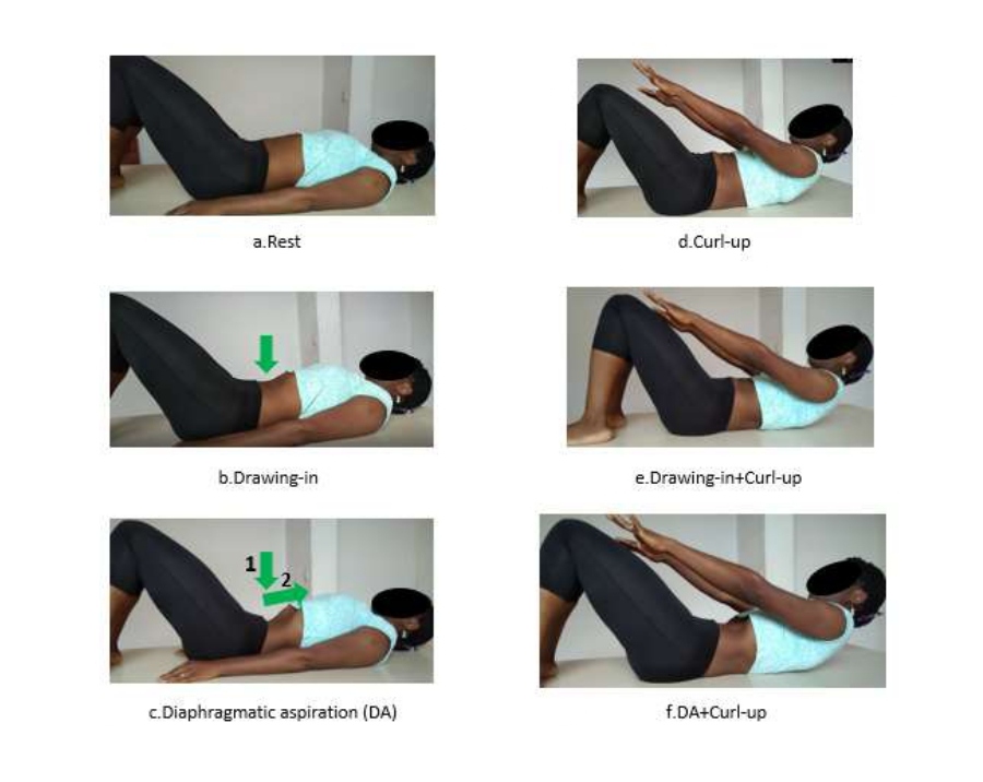 The aim of this study was to investigate the acute effect of DA+Curl-up and other abdominal exercises (Curl-up, DA, Drawing-in, Drawing-in+Curl-up) on the IRD in Beninese postpartum women diagnosed with diastasis recti.